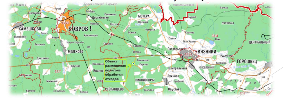 Объект размещения технологического комплекса располагается на территории Владимирской области, Вязниковского района, в границах муниципального образования Октябрьское. На земельных участках с кадастровым номером: 33:08:100102:139; 33:08:100102:22; 33:08:100102:20; 33:08:100102:16; 33:08:100102:138.Общей площадью 4,687 Га. С санитарно-защитной зоной более 500м. Из них 1,5 Га специального назначения под размещение объектов отходов потребления (СН-4). На участок с кадастровым номером 33:08:100102:139 получена лицензия на обработку, сбор и транспортирование отходов III, IV классов опасности. Объект имеет выгодное территориальное расположение в 3 км от федеральной автомобильной дороги М-7 «Волга», 25 км до административного центра г.Вязники, 65 км до восточной границы Владимирской области г.Гороховец. Весь транспортный маршрут осуществляется по асфальтобетонному покрытия капитального типа.